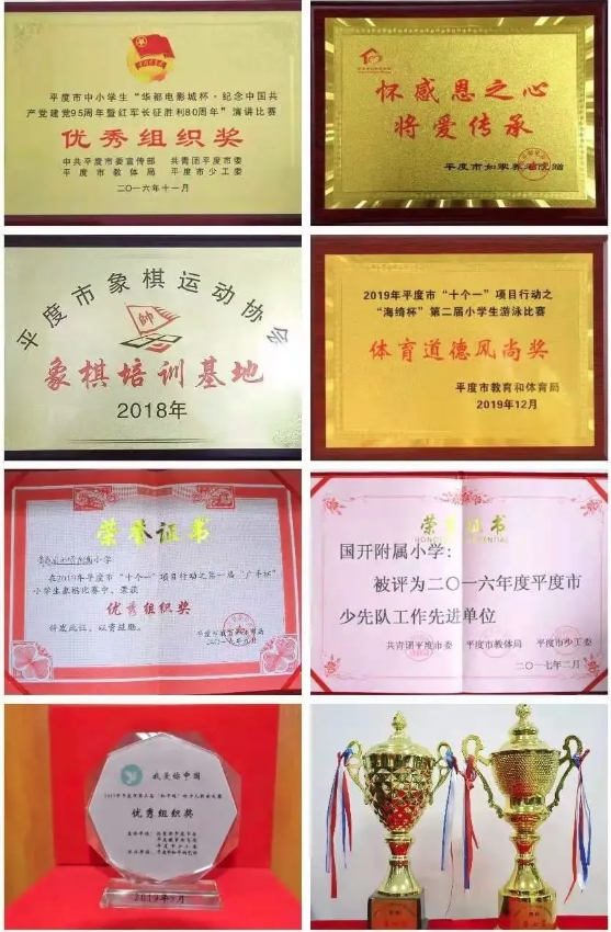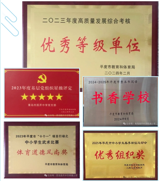 学校教育教学成果斐然,青岛国开中学党支部连续两年在基层党组织星级评定中荣获五星党支部。学校被评为“山东省绿色学校”,“平度市少先队工作先进单位”,平度市“书香学校”。此外,学校连续多年荣获平度市高质量发展综合考核“优秀等级单位”,多次位列平度市教育和体育局年终督导评估民办学校第一名,在平度市运动会、平度市“十个一”项目行动之小学生武术比赛、象棋比赛、游泳比赛等赛事中荣获“优秀组织奖”、“体育道德风尚奖”、平度市各类书画比赛中荣获“优秀组织奖”。