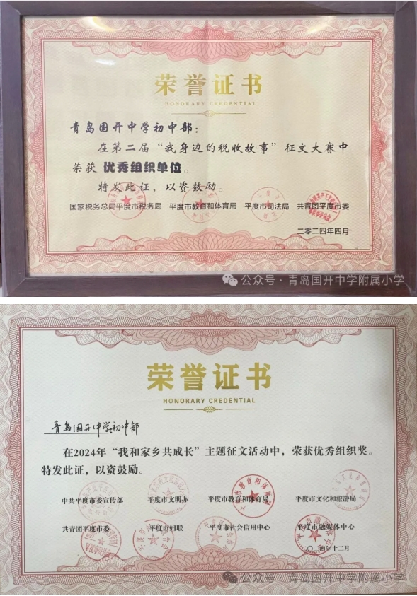 学校以党建引领铸就教育根基,青岛国开中学党支部连续两年在基层党组织星级评定中荣获五星党支部,彰显出先锋堡垒作用。学校教育教学成果斐然:荣获“山东省绿色学校”、连续多年荣获平度市高质量发展综合考核“优秀等级单位”、平度市“书香学校”,在青少年模拟法庭大赛、青岛市青少年未来工程师博览活动、中小学生春季田径运动会、平度市中小学武术比赛、各类主题征文比赛等赛事中屡创佳绩。系列荣誉镌刻着学校“为党育人、为国育才”的使命担当,谱写出基础教育高质量发展的生动篇章。