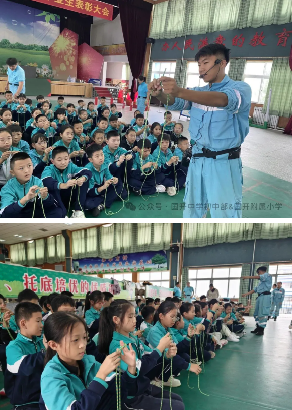 活动伊始,绳索技能学习吸引了同学的目光。在专业指导老师的耐心讲解和示范下,孩子们兴致勃勃地学习了连接结、固定结和节结等多种实用绳结的打法。一双双小手认真地缠绕、穿梭、拉紧,看似简单的绳索在孩子们手中变成了关键时刻能救命的重要工具。同学们纷纷表示,学会了这些绳结,无论是在野外活动还是紧急情况下逃生自救,心里都更有底了。