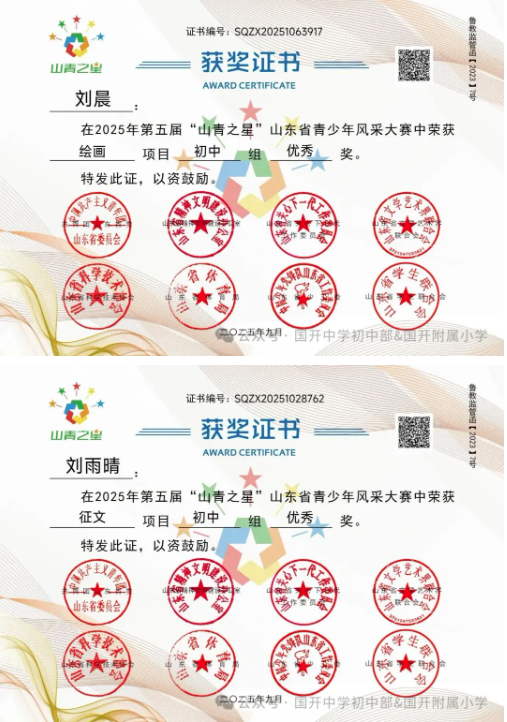 捷报频传奏凯歌,硕果飘香誉满园。 近日,由共青团山东省委主办,多家省级单位支持的2025年第五届“山青之星”山东省青少年风采大赛评选结果揭晓。国开中学初中部、国开附属小学的学生在 “逐梦科技星河 点亮青春之光” 美育比赛单元中表现卓越,成绩斐然,共斩获22项大奖,充分彰显了国开学子出色的艺术才华和全面的综合素养。