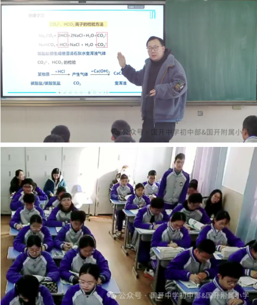 化学课堂则展现了一场别开生面的“跨界”探索。孙添琦老师以“一门父子三词客”的文学佳话为引,借助诗词大会的趣味形式带学生走近“文学三苏”,随即巧妙切换视角,引出化学世界的独特“三苏”——聚焦于碳酸钠与碳酸氢钠这对核心物质。课堂从二者具体的性质与反应出发,抽丝剥茧,引导学生深入推导复分解反应的实质,带领学生突破现象看本质,真正实现从“知其然”到“知其所以然”的认知飞跃。这节充满巧思的课,不仅扎实地夯实了化学知识基础,更让学生领略了文理交融的思维乐趣与学科魅力。